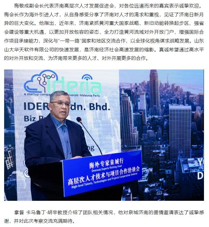 •   We are immensely grateful to our visionary advisor, Datuk Prof. Kamarudin Hussin, for presenting IDERIA to China and opening new doors of opportunity. IDERIA had the privilege of representing our technology on the international stage at the prestigious Quancheng High-level Talent Technology and Project Cooperation Conference. This remarkable event took place at the esteemed Jinan Yinfeng Ramada Hotel and Shenzen Nanhai International Holdings, where we had the honor of presenting and participating in a captivating round table discussion on AI and humanizing technology.